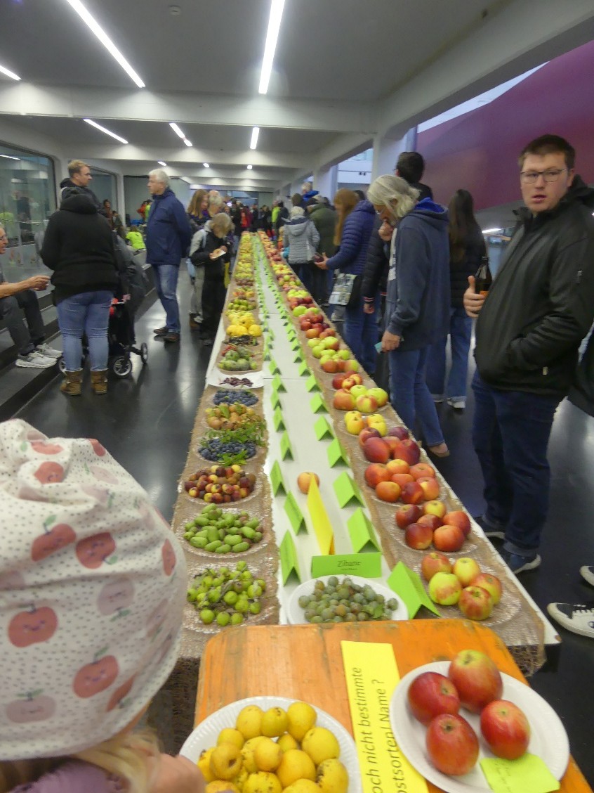 Zusammengestellt von den drei Experten Albert Föll, Werner Maier und Joachim Reutter konnten 160 verschiedenen Apfel,- Birnen,- und Wildobstsorten mit ausführlicher Beschreibung gezeigt werden. Über Wochen wurde auf den Streuobstwiesen im Mössinger Einzugsgebiet die unterschiedlichen Früchte gesammelt, bestimmt, fachgerecht gelagert und im Rahmen der Ausstellung präsentiert. Der enorme Andrang des Publikums zeigt einmal mehr das große Interesse an heimischen Streuobstsorten. Viele Besucher brachten eigene Früchte zur Sortenbestimmung mit, was unseren drei Experten in den allermeisten Fällen gut gelang. Ein herzlicher Dank an alle Teilnehmer, Helfer und Helferinnen für das außergewöhnliches Engagement!