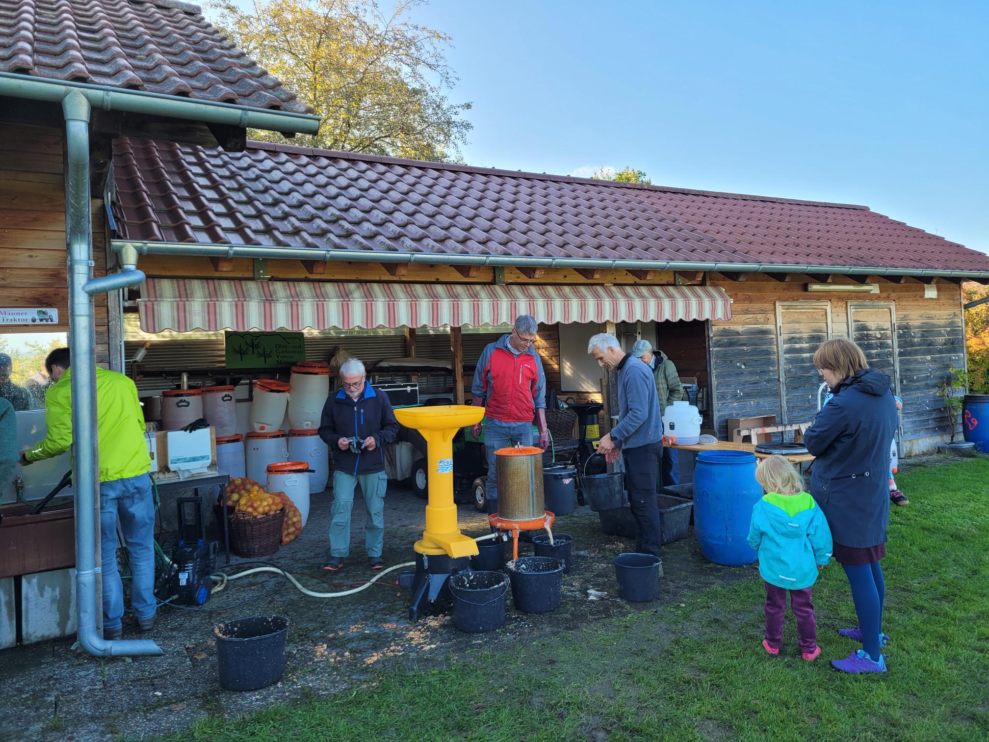 Am Samstag, den 11. Oktober veranstaltete der OGV Mössingen wieder seinen Kleinmostertag bei feinstem Mostwetter im Lehrgarten und alle die kamen hatten ihre Freude am selbstgemachten Süßmost. Das Obst war reif zum Mosten und der Andrang der Mosterinnen und Moster war stetig. Die Oma kam mit ihrem Enkel und ein paar Kisten Äpfel, Familien bestaunten wie einfach aus einem Karton Äpfel und Birnen ein Karton Bag in Box wird, viele nutzten die Äpfel aus dem Vorgraten und nahmen einen frischen Saft mit nach Hause. Neben dem klassischen Mostansatz wurde Maische für Schnaps aber auch für feinen Apfelessig zur Gärung angesetzt und nicht zu vergessen –Bag in Box wurde in größeren Mengen abgefüllt. Über den Tag waren alle Altersgruppen vertreten – die kleinste Teilnehmerin war gerade 18 Monate alt und dann ging es aufwärts bis weit über die 80. Die Qualität der gepressten Säfte war sehr gut, die Süße lag konstant zwischen 50° und 60° Oechsle was auf einen guten Most hoffen lässt. Die Ergebnisse lassen sich dann bei der Mostprämierung in 2026 verkosten und bewerten. Dank der tollen Teamarbeit der OGV Moster war die Veranstaltung einmal mehr ein schönes Beispiel dafür, wie wichtig Vereinsarbeit für das Interesse und damit den Erhalt unserer heimischen Streuobstkultur ist.
