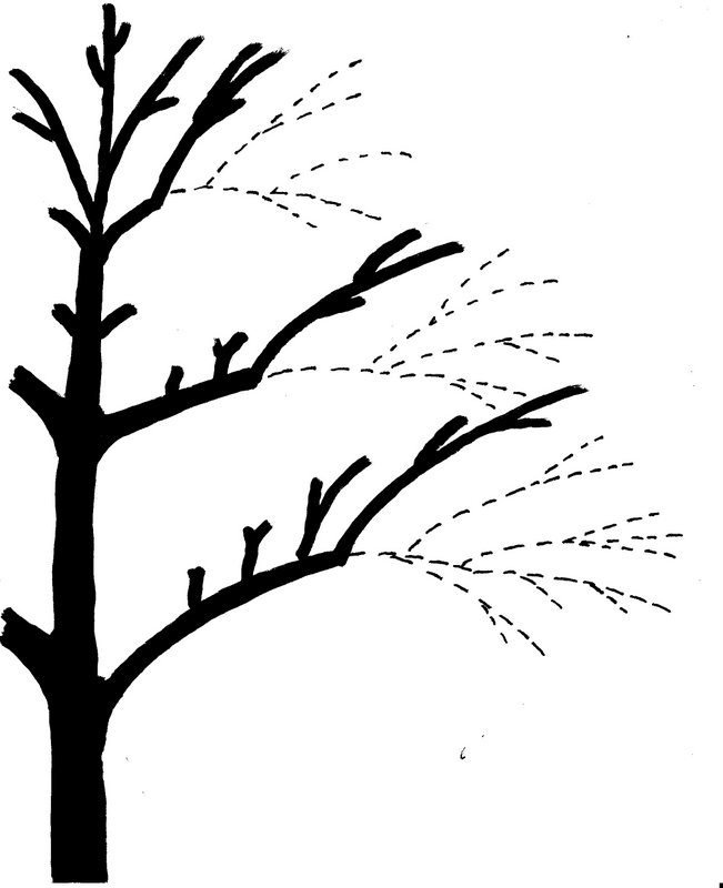 Stammverlängerung,Leitäste und Seitenäste sind als Grundgerüst mit nach außen gerichteten Fruchtästen besetzt, die in der Skizze oben fehlen